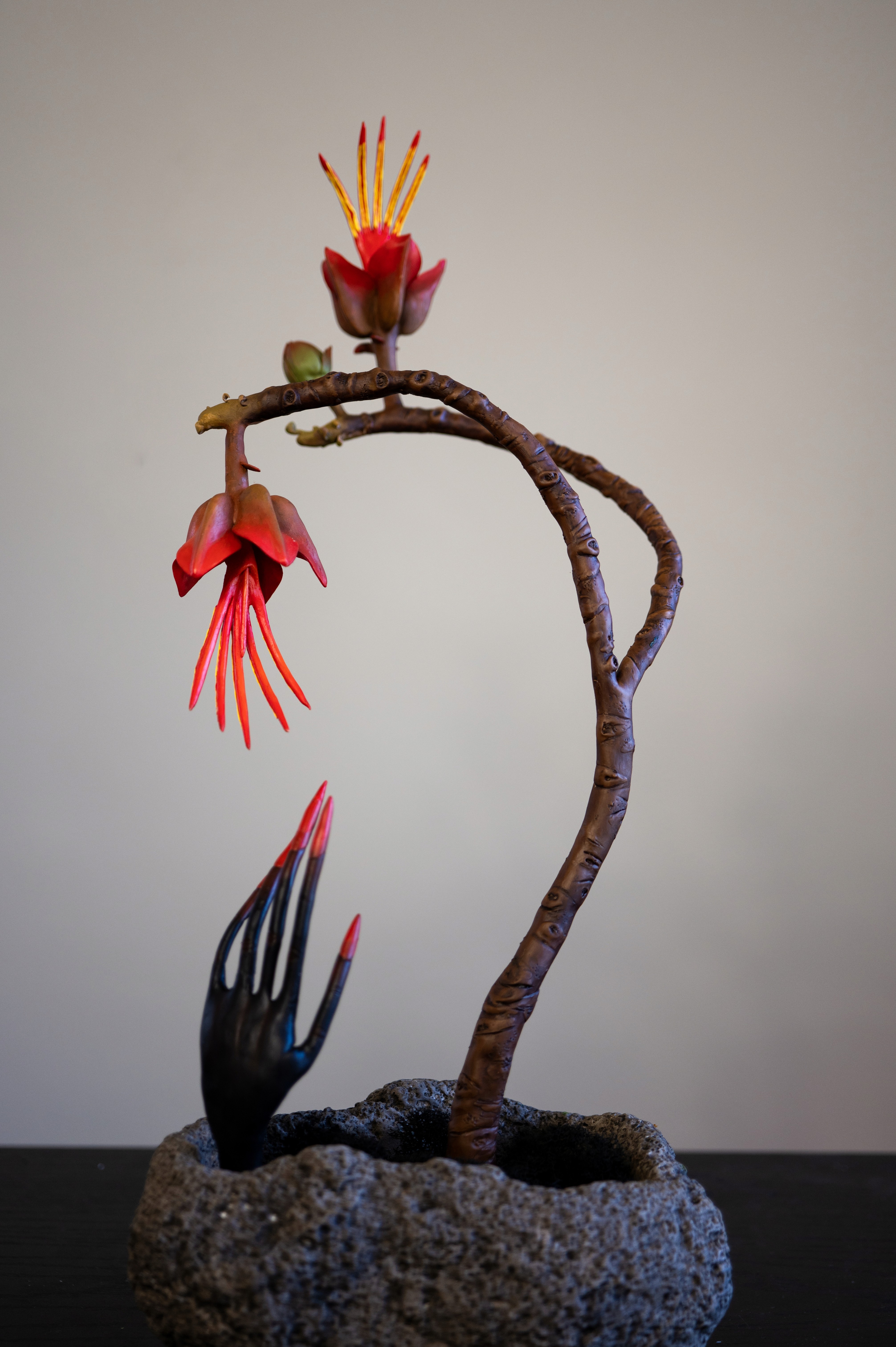 Every element, from the bark of the branch to the fine veins of flower petals, from the delicate bud to the green leaves, is sculpted in Cold porcelain clay and painted by hand using Oil colors to convey vibrancy and depth. Other added elements like hand, that add complete the sculpture, are also sculpted the same way.
